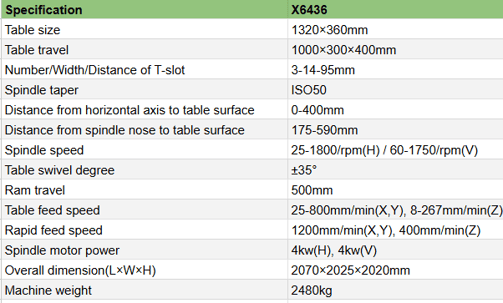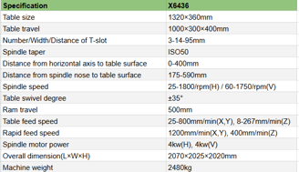 It is seen that there are variations of this machine, such as the X6436, X6436C, and X6436CLW, these variations change the table sizes, and travel distances of the tables. This allows for the user to choose a machine that best fits their work piece size.